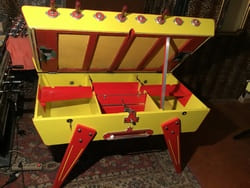 Si la restauration a été moindre que sur d'autres babyfoots, mon intervention a consisté dans l'élaboration d'une structure, à savoir l'installation de quatre colonnes, pour soutenir la plaque de verre, qui a été fabriquée sur mesure, pour en faire une table.